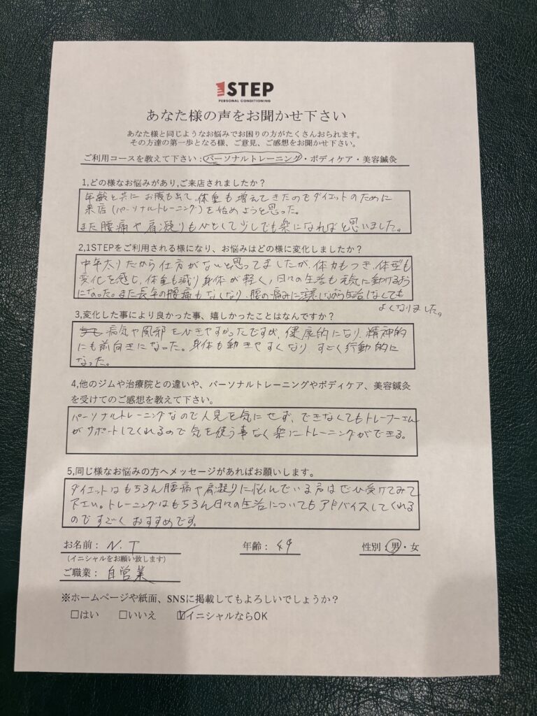 N.T様(49歳)|腰痛改善、ダイエット